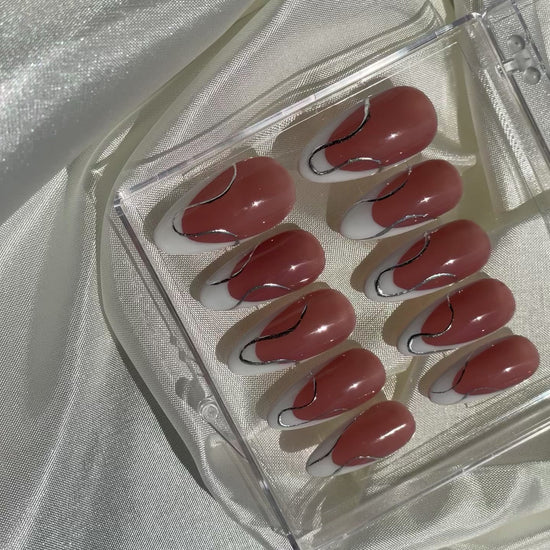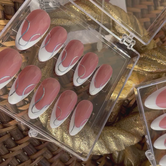 Soft blush medium almond frenchies with a twist of silver .